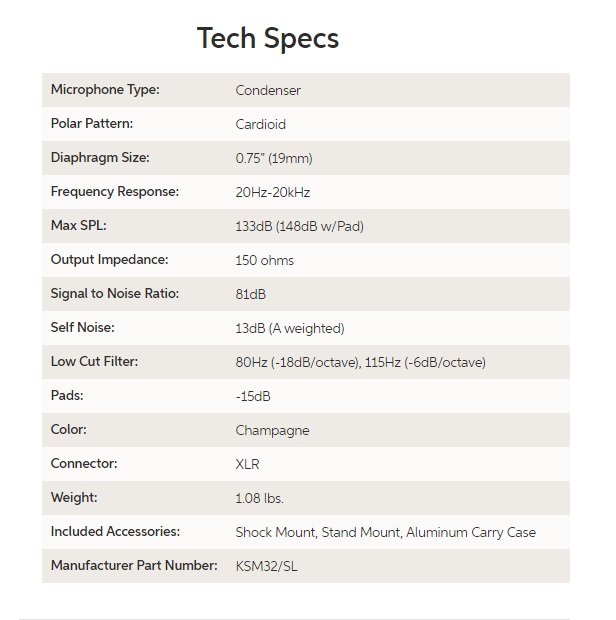 View more about Shure KSM32/SL Studio Condenser Microphone (Champagne) on main site